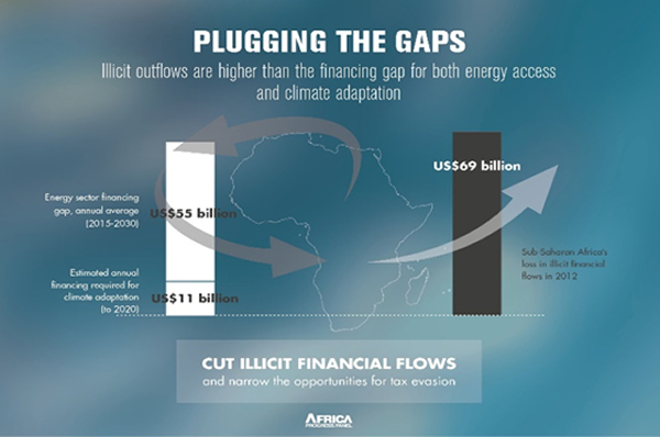What do the numbers on illicit financial flows reveal in terms of missed development opportunities? African governments are denied the finance needed to bridge the continent’s huge infrastructure deficit. Let’s take energy, for example. Today, two thirds of Africans – over 645 million people – lack access to electricity. The continent’s power outages is costing it some 2-4% of GDP per year. Africa lost up to $69bn from illicit financial flows in 2014. This is more than the total annual financing required to meet Africa’s energy and climate adaptation needs of about $66bn: $55bn for energy (from 2015-2030) and $11bn for climate adaptation (up to 2020).