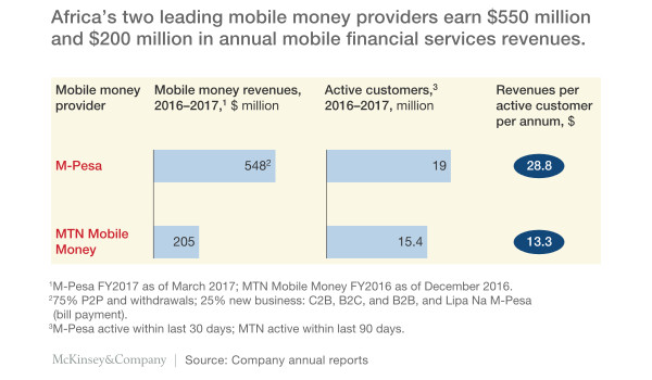Of these considerable strengths, distribution is the MNOs’ main advantage. Thirty-seven African markets have 10 times more registered agents than bank branches. In Kenya, for example, Safaricom has more than 130,000 agents where customers can cash in or cash out. By contrast, leading banks in Kenya, where agency banking has been highly successful, have approximately 15,000 agents.