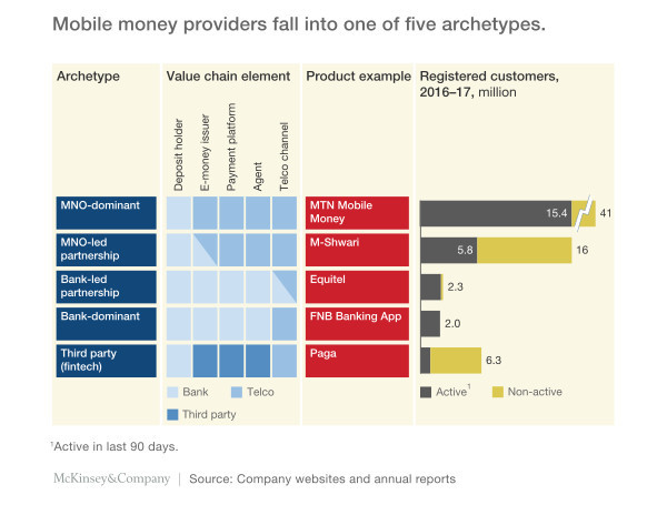 Africa’s mobile money market has expanded and diversified in recent years. Providers today fall into one of five different archetypes, defined according to which segments of the mobile money value chain they cover (Exhibit 3).